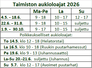 Taimistomme Raahessa on kasvattanut monivuotisia kukkia yli 40 vuotta. Runsaan perennavalikoiman lisäksi taimimyymälässämme on monipuolinen valikoima hedelmä- ja lehtipuita, havuja, koristepensaita, ruusuja, köynnöksiä, marjapensaita ja muita hyötykasveja. Kasvatamme myös harvinaisempia perennoja ja luonnonkasvien taimia.