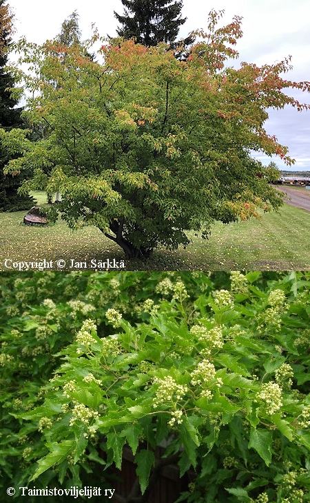 Lisätietoja: Pieni, leveälatvuksinen puu, jolla kauniit, kiiltävät lehdet. Voimakas oranssinpunainen syysväri.