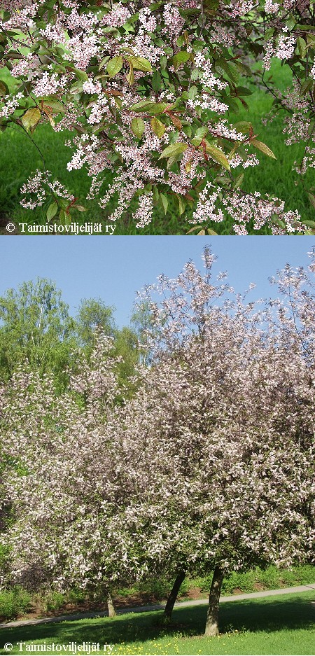 Lisätietoja: Tummanpunalehtinen, vaaleanpunakukkainen tuomi. Luonnon tuomea kestävämpi tuholaisia vastaan. Marjat eivät syötäviä.